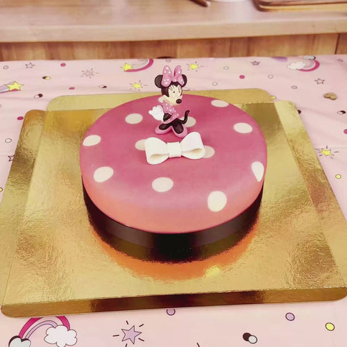 Tort u podstawy przystrojony jest czarną wstążeczką tortową. Cała powierzchnia wypieku pokryta jest wysokiej jakości masą marcepanową z kalifornijskich migdałów koloru różowego w białe kropeczki. Całość dopełnia figurka przedstawiająca Myszkę Minnie® oraz wspaniały dziewczęcy akcent...